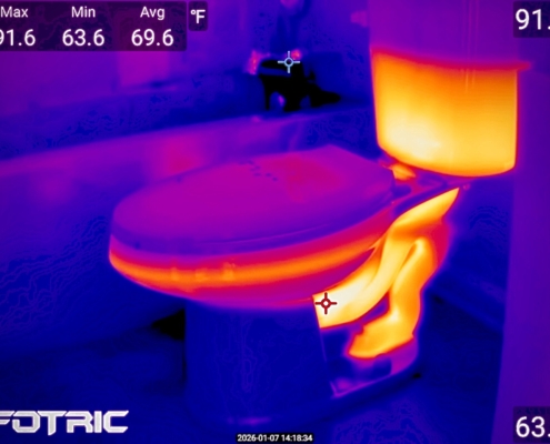 The ability of a material to store heat is known as thermal capacitance. Roofing materials typically have low thermal capacitance. In contrast, water has high thermal capacitance. Here’s how it matters: During the day, as the sun heats up the roof, moisture trapped in the insulation also warms. When evening arrives and the roof cools down, wet insulation areas take longer to lose heat. Consequently, these damp spots appear as “hot spots” on the roof surface. During the survey, we mark these areas with paint and include them in the detailed report.